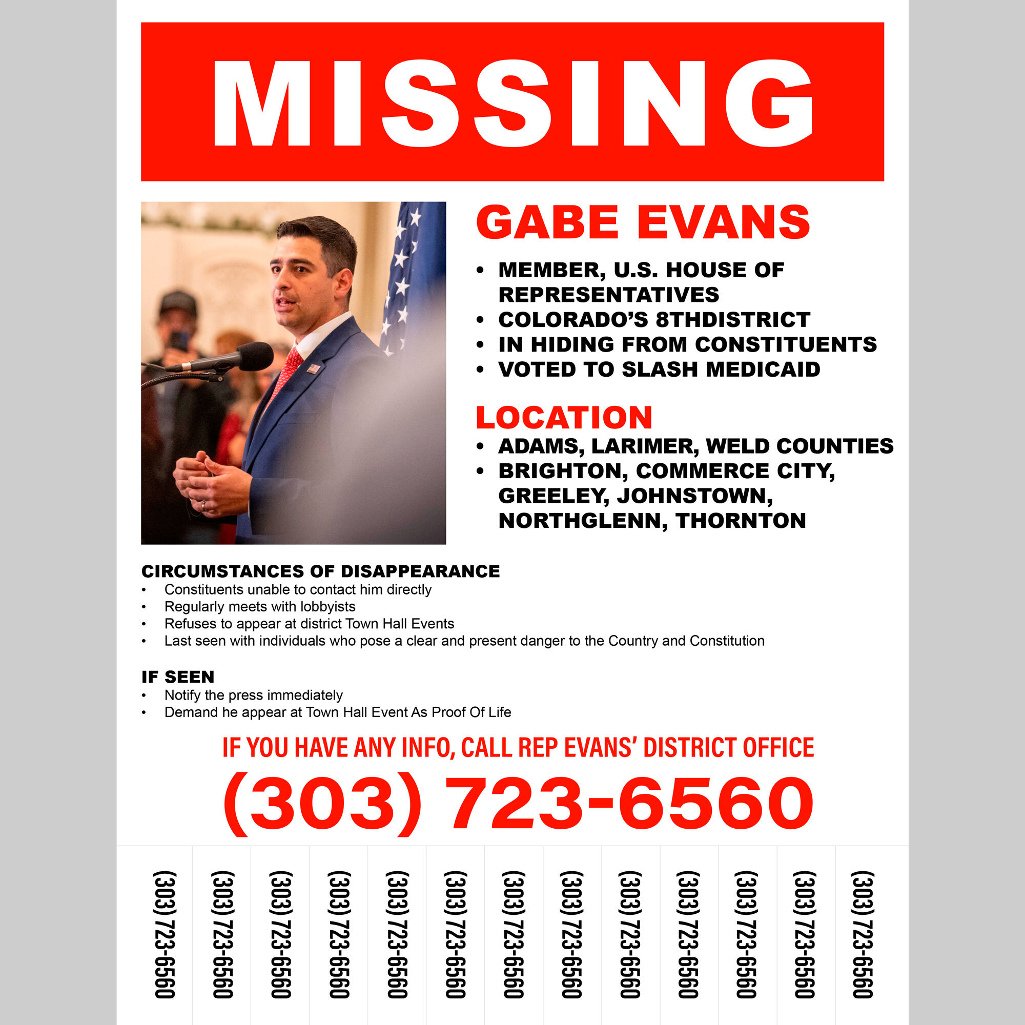 Features: Photograph of Member of Congress with “Last Seen” information, district location, and district phone number. Includes tear away phone number for district office. Bold eye-catching red type in classic “Missing Person” style layout. Easily printable. Size: 8.5×11″