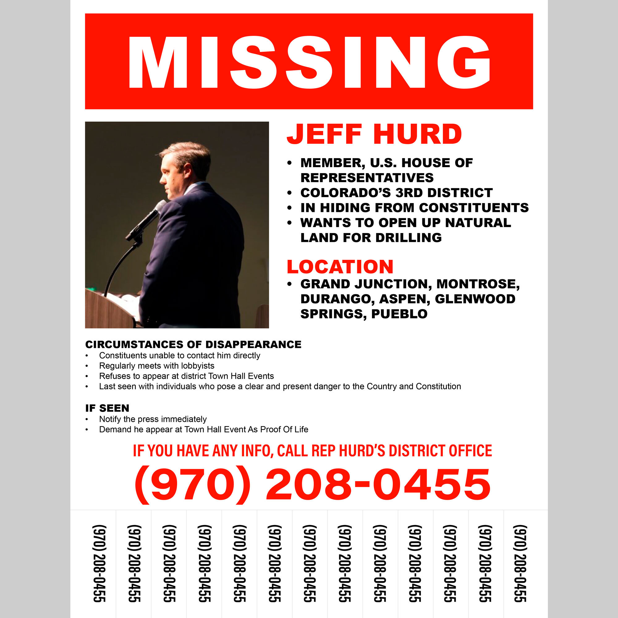 Features: Photograph of Member of Congress with “Last Seen” information, district location, and district phone number. Includes tear away phone number for district office. Bold eye-catching red type in classic “Missing Person” style layout. Easily printable. Size: 8.5×11″