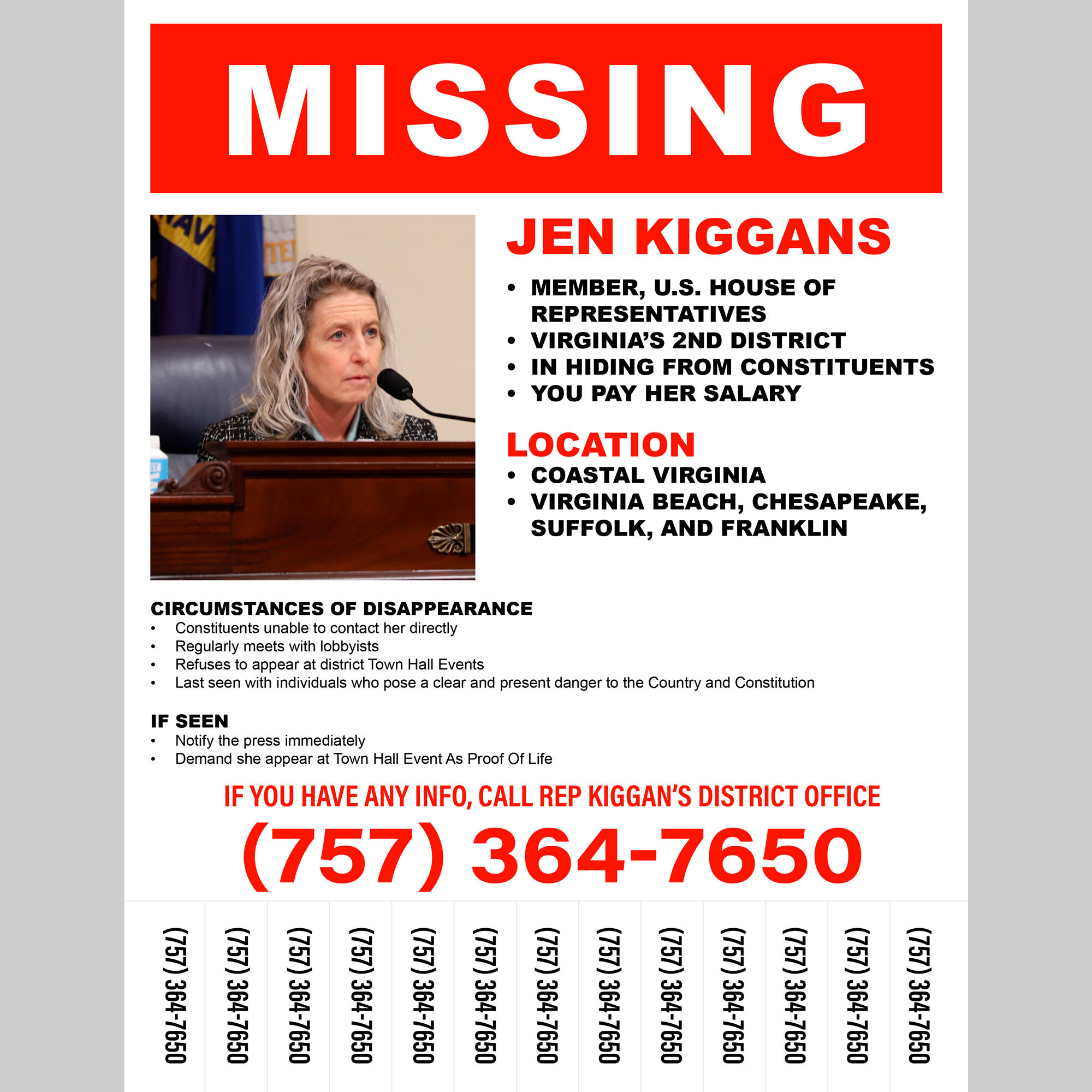 Features: Photograph of Member of Congress with “Last Seen” information, district location, and district phone number. Includes tear away phone number for district office. Bold eye-catching red type in classic “Missing Person” style layout. Easily printable. Size: 8.5×11″