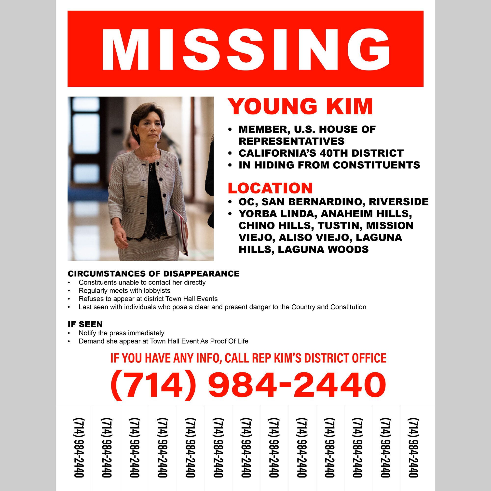 Features: Photograph of Member of Congress with “Last Seen” information, district location, and district phone number. Includes tear away phone number for district office. Bold eye-catching red type in classic “Missing Person” style layout. Easily printable. Size: 8.5×11″