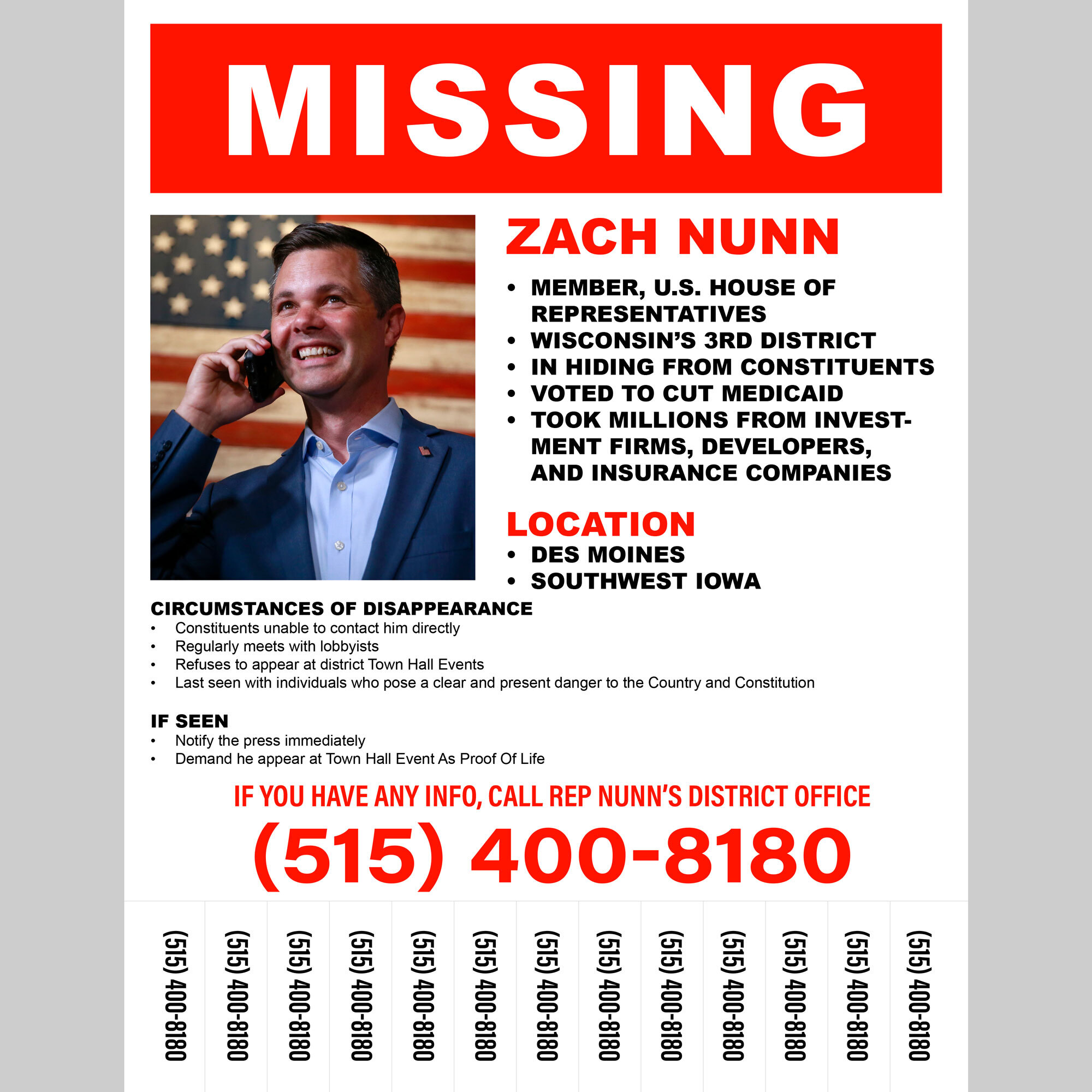 Features: Photograph of Member of Congress with “Last Seen” information, district location, and district phone number. Includes tear away phone number for district office. Bold eye-catching red type in classic “Missing Person” style layout. Easily printable. Size: 8.5×11″