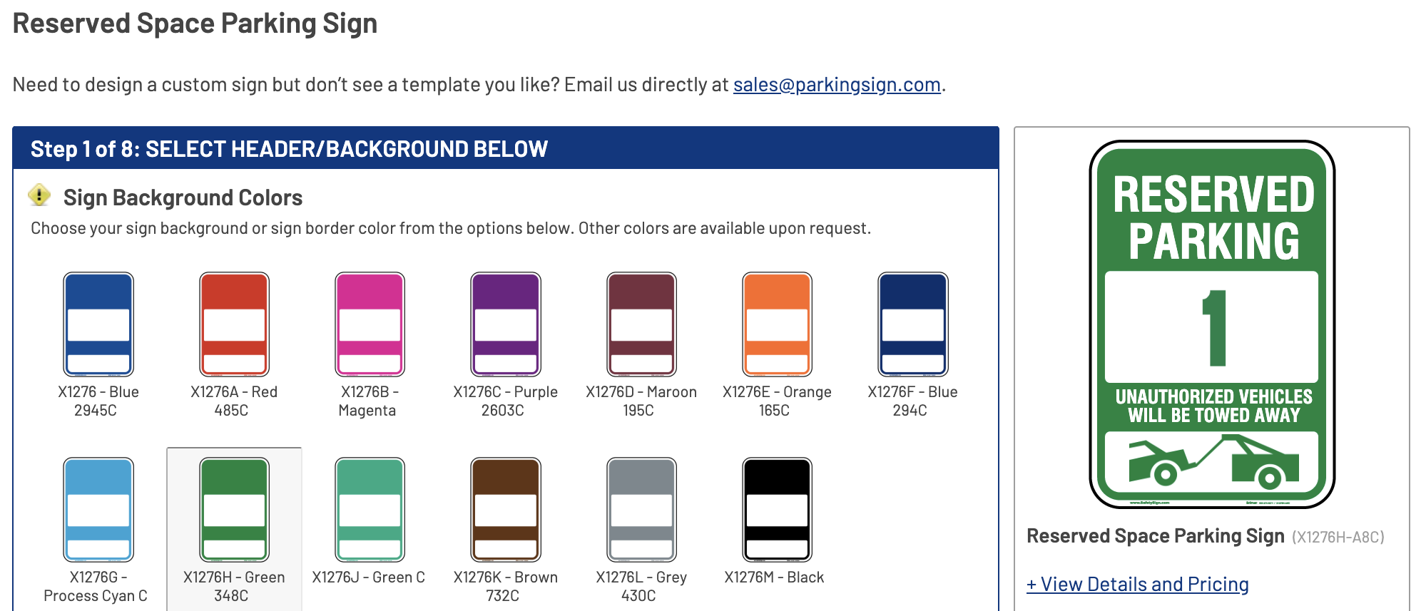 - Using a sign creation company like ParkingSign.com to order signage. If using ParkingSign.com, start at the Reserved Parking Space Template. Select Green-348C as the color, 11×14 for the size, and put the appropriate copy in the top area.