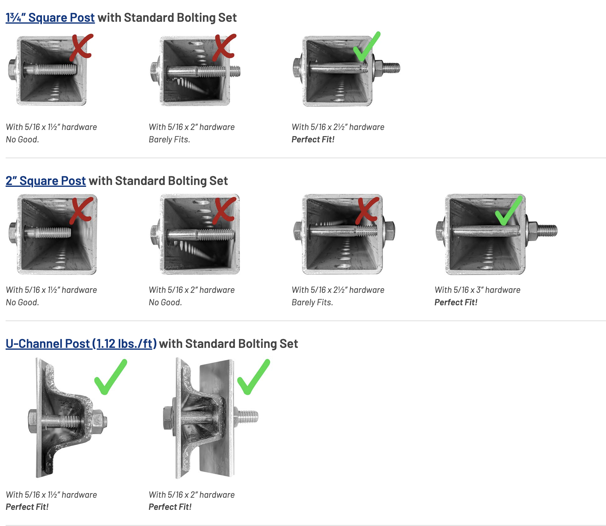 – STEP 7 (Upgrades & Options): Anti-Graffiti Overlaminate: None; Mounting Options: Two 7/32″ holes (one at top, one at bottom) Whichever hole option you select, be sure to purchase corresponding bolting set below. - Before ordering your materials, we suggest adding a Bolting Set (see below) for each sign. Additional information about installation methods can be found on ParkingSign’s website here.