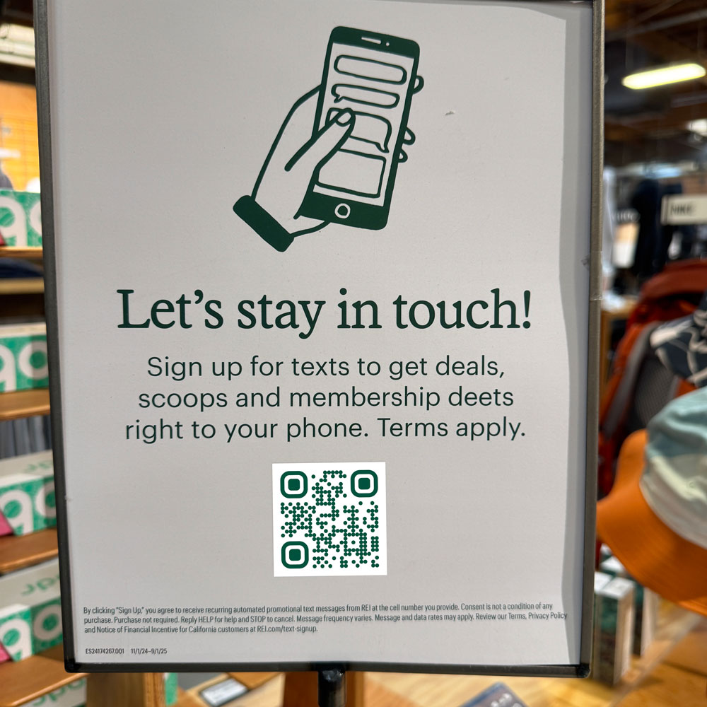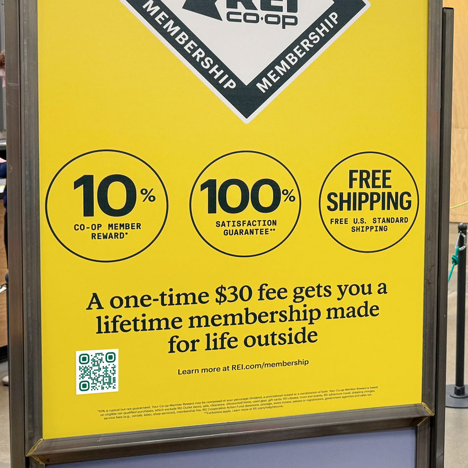 We’ve noticed an error wherein the QR code on REI Stay In Touch materials mistakenly goes to the main REI website rather than OurREI.com where co-op members and customers can learn more about our board in an authentic and transparent way. Rather than incur the expense of printing all new marketing materials, O&D suggests simply covering the existing QR code with a sticker that links to the correct website.